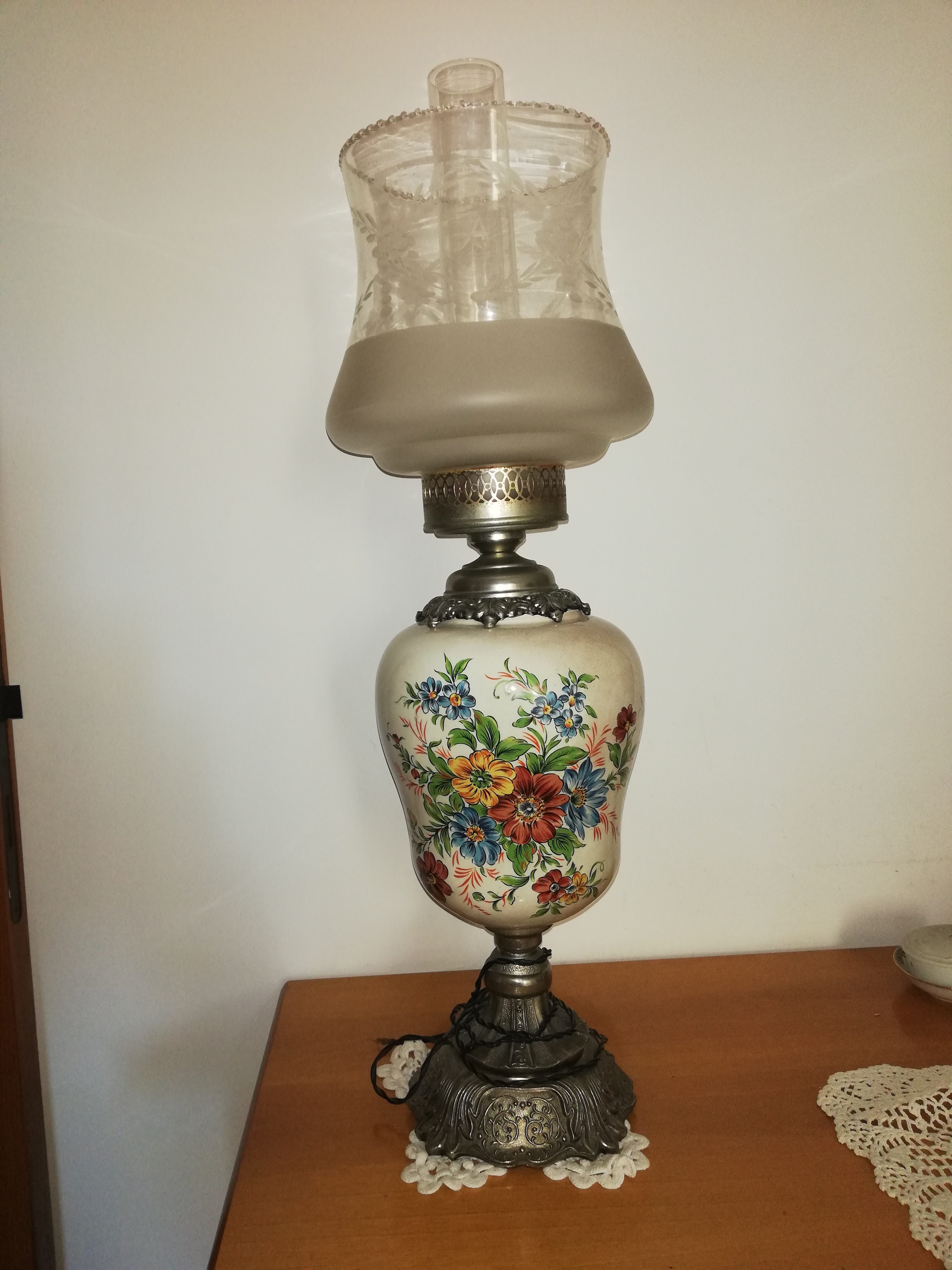 Lampada da tavolo, decorata nella parte ceramica e con vetro finemente cesellato