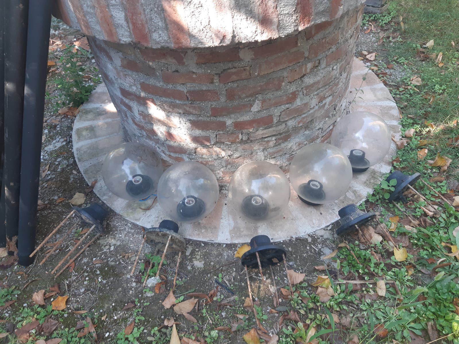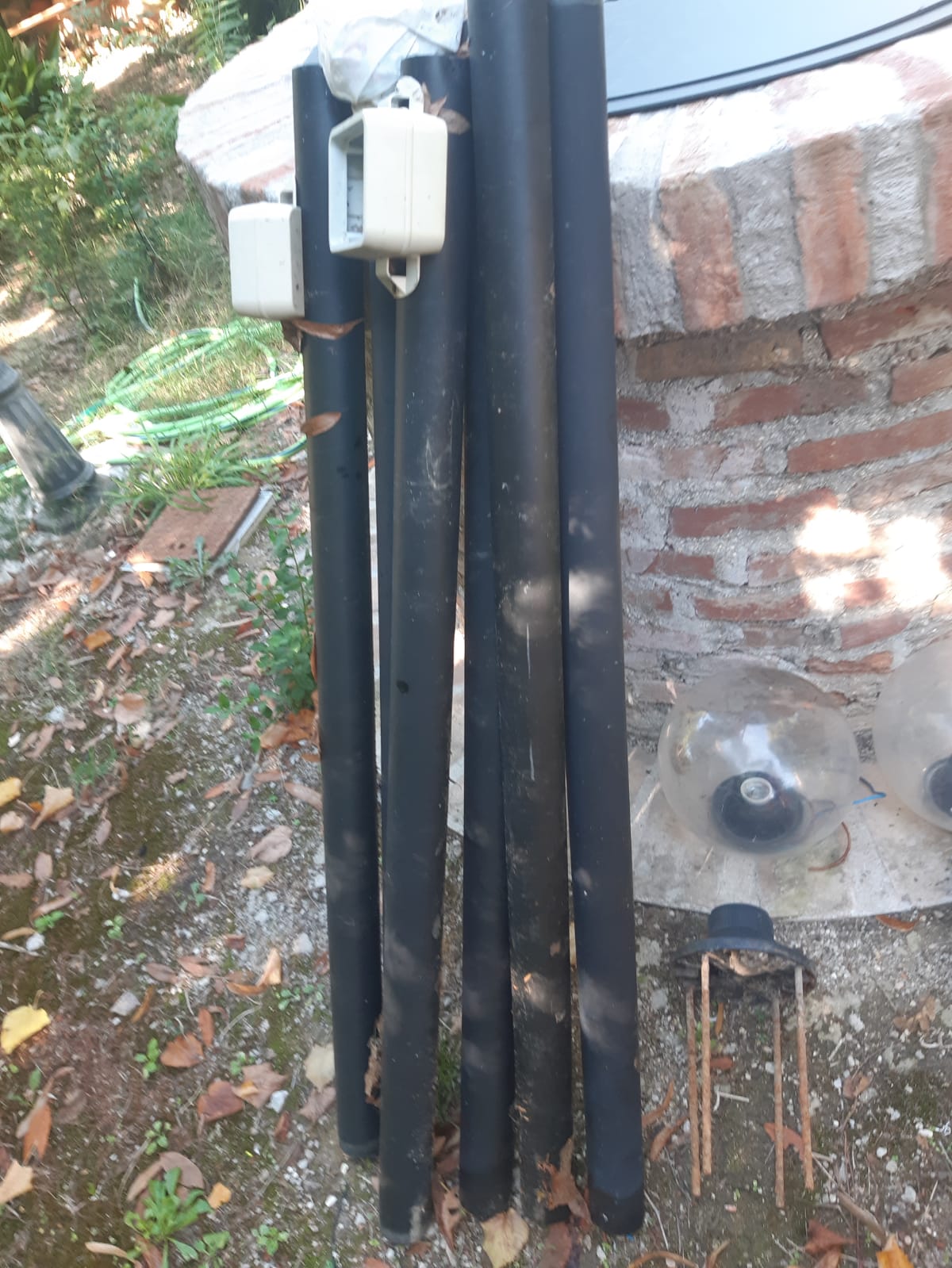 Lampioni da giardino in plastica. Altezza cm 140. Diametro dei globi cm 25.