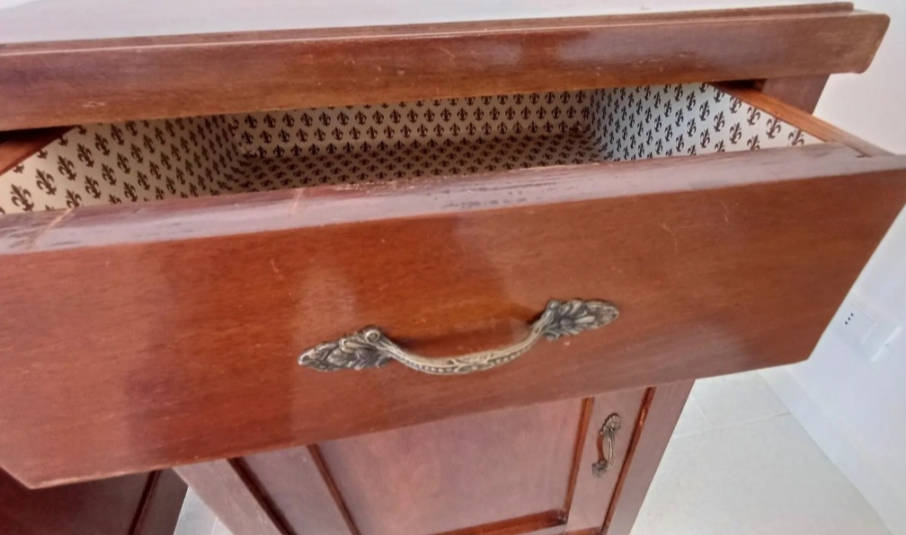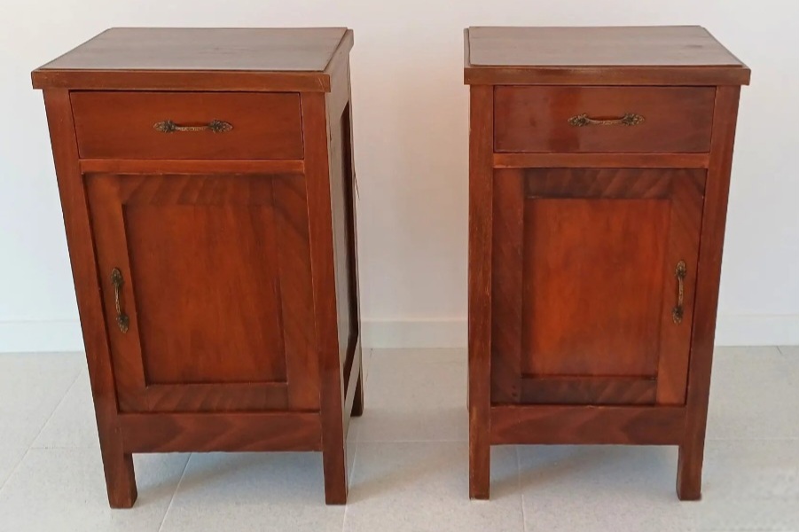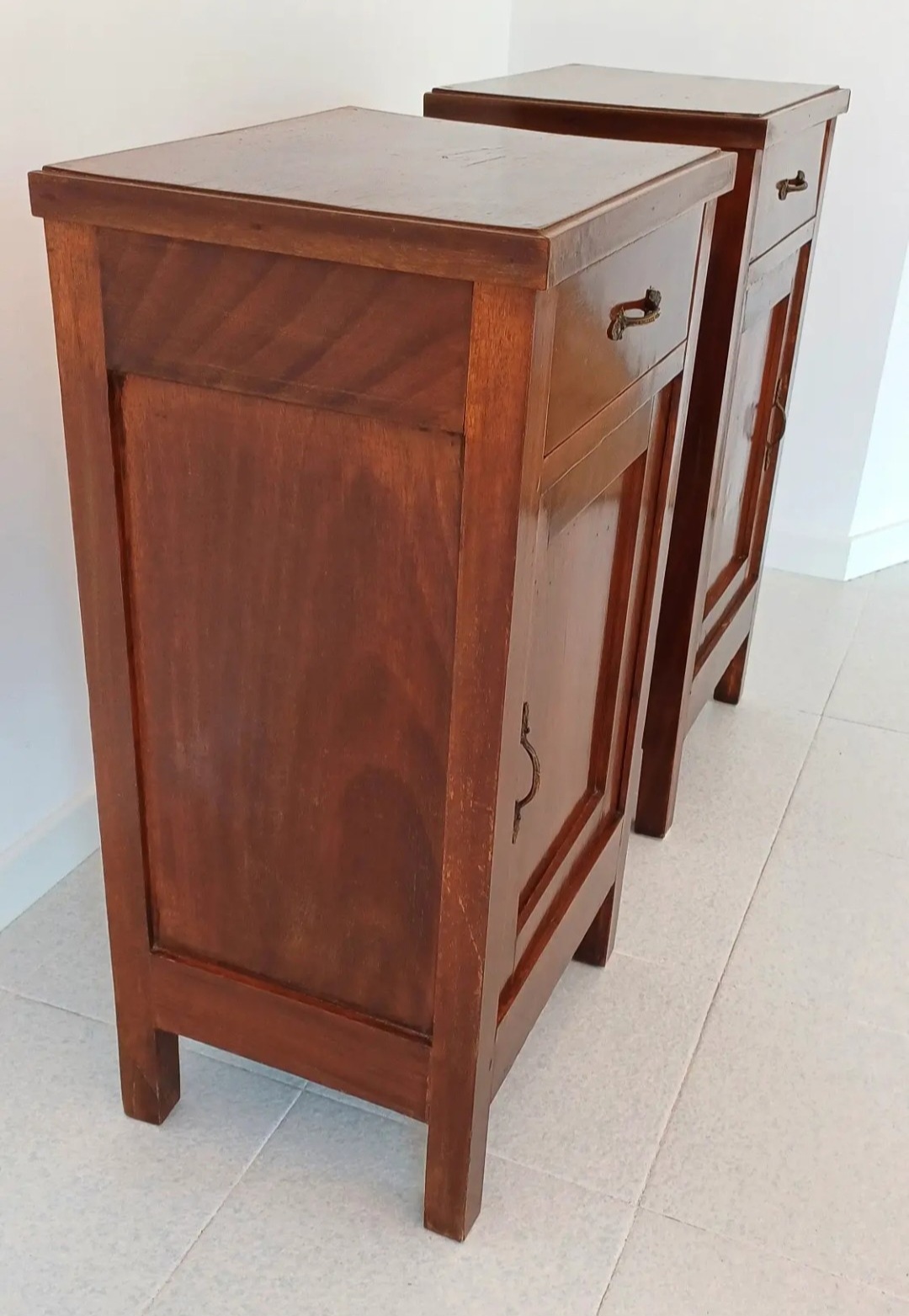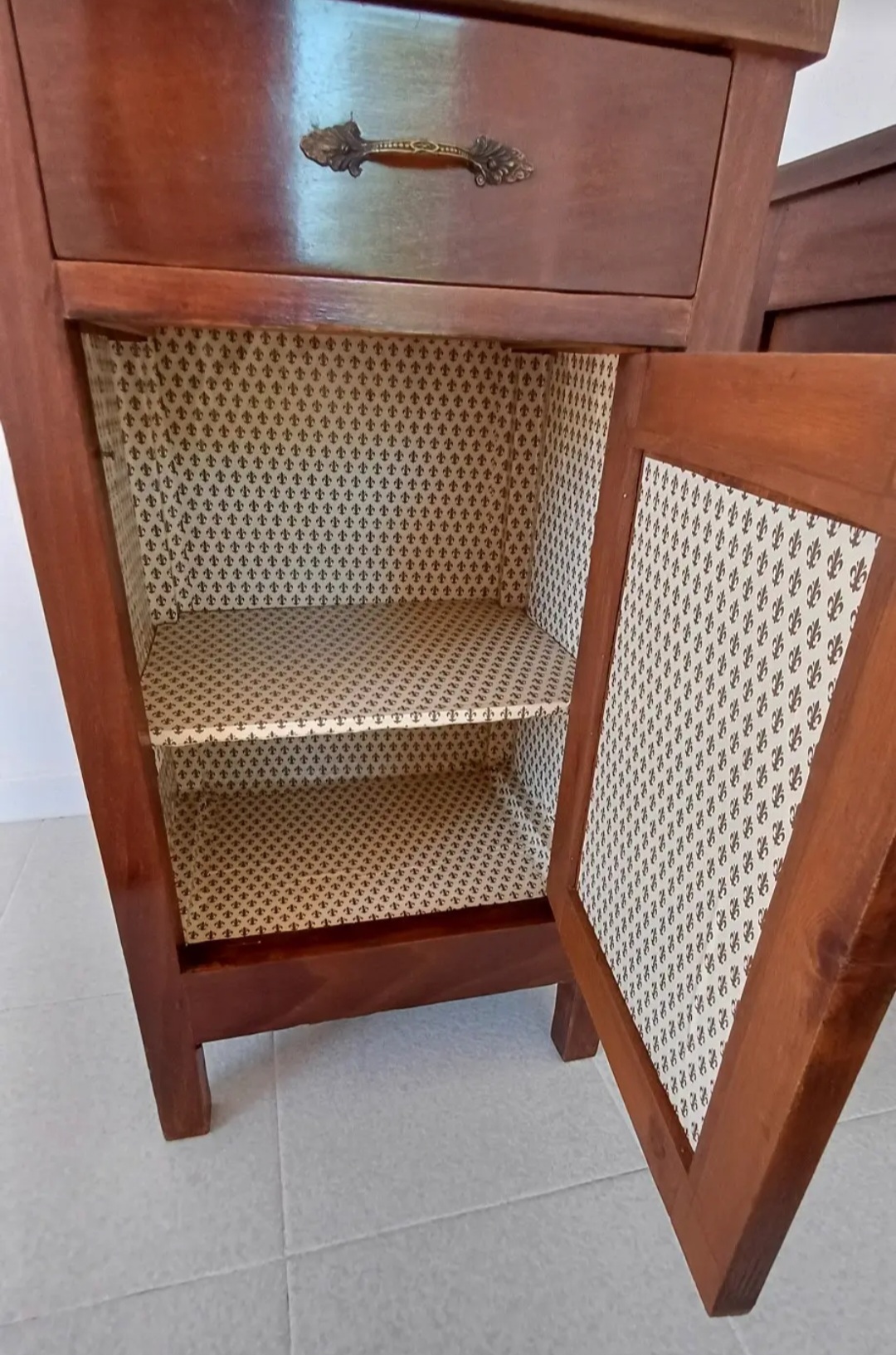 Comodini antichi di legno con cassetto e sportello con ripiano. Interno foderato.