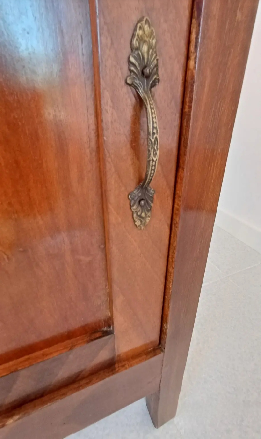 Coppia di comodini in noce fine '800 primi novecento uno con originale alzatina sempre in noce con modanature e mensolina cassetto e ripiani prevedere piccolo r